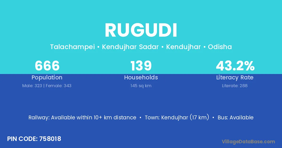 Joda (21 km) is the nearest town to Rugudi village for major economic activities and is located approximately 21 km away.