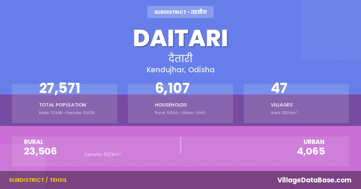 According to the 2011 census The total area of Daitari Tehsil is 282 km², with a population of 27571 people. The population density is 98 inhabitants per square kilometre, and there are approximately 6107 houses in the sub district.