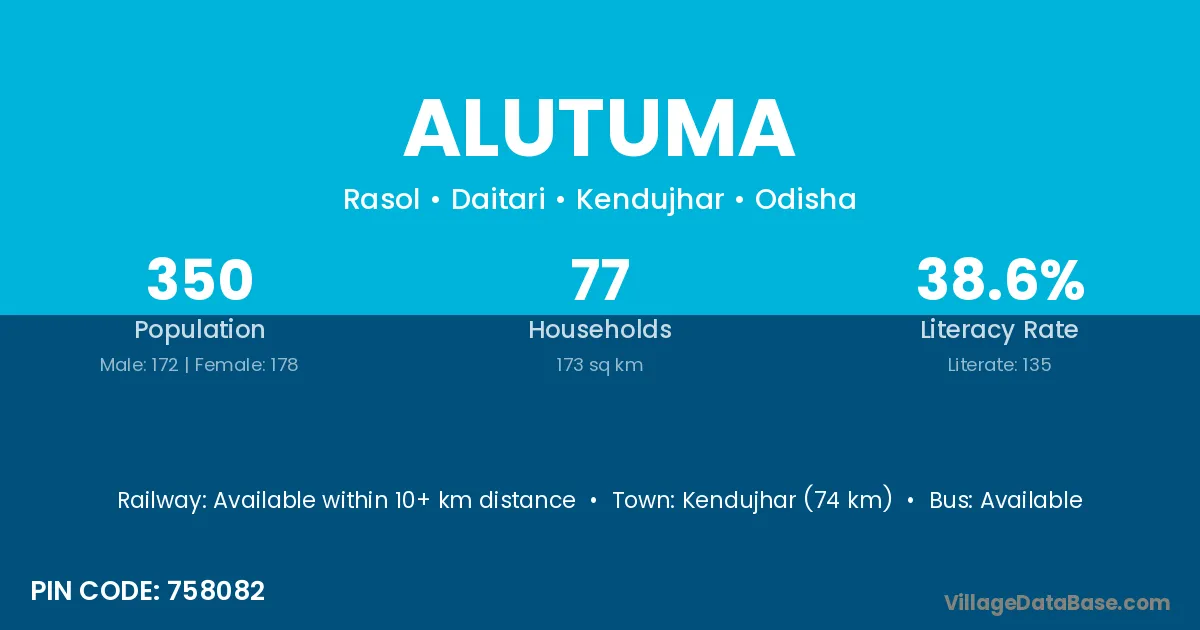 Kendujhar (74 km) is the nearest town to Alutuma village for major economic activities and is located approximately 74 km away.