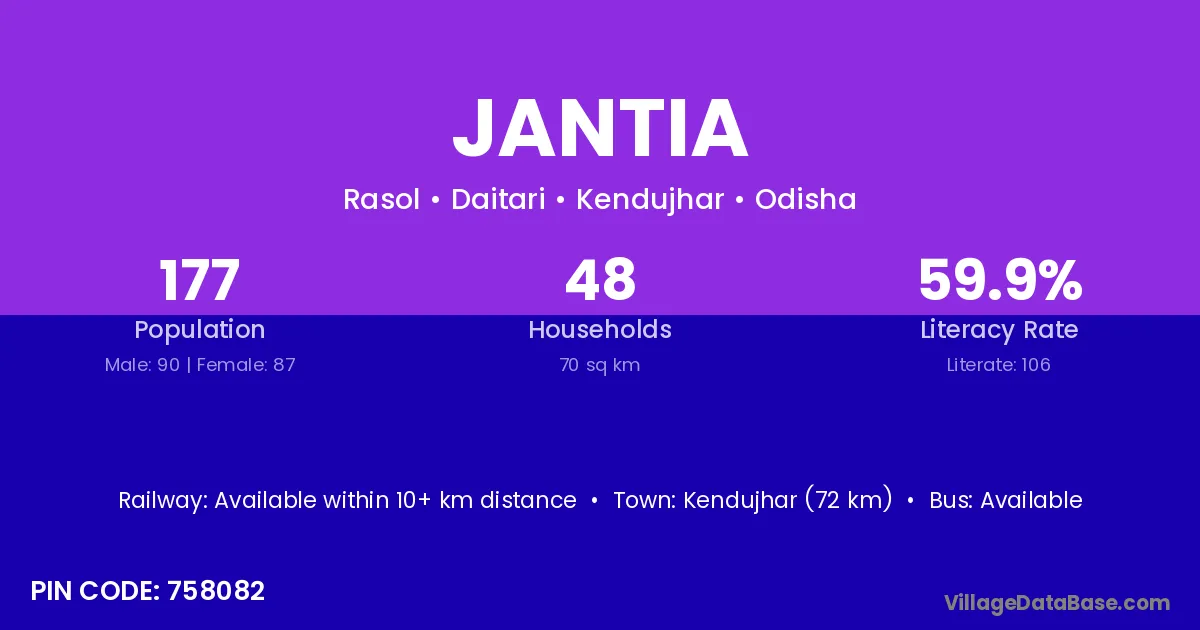 Kendujhar (72 km) is the nearest town to Jantia village for major economic activities and is located approximately 72 km away.