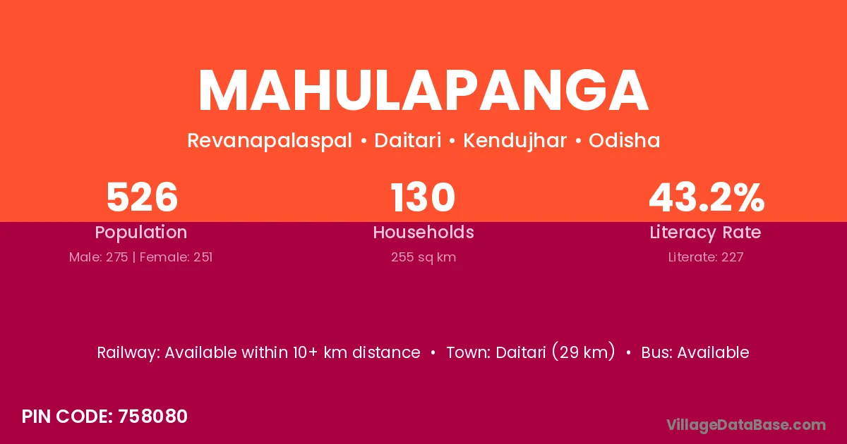 Mahulapanga village is located in the Daitari Tehsil of the Kendujhar district in Odisha .