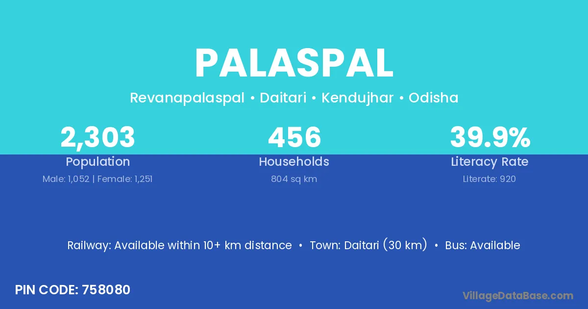 Daitari (30 km) is the nearest town to Palaspal village for major economic activities and is located approximately 30 km away.