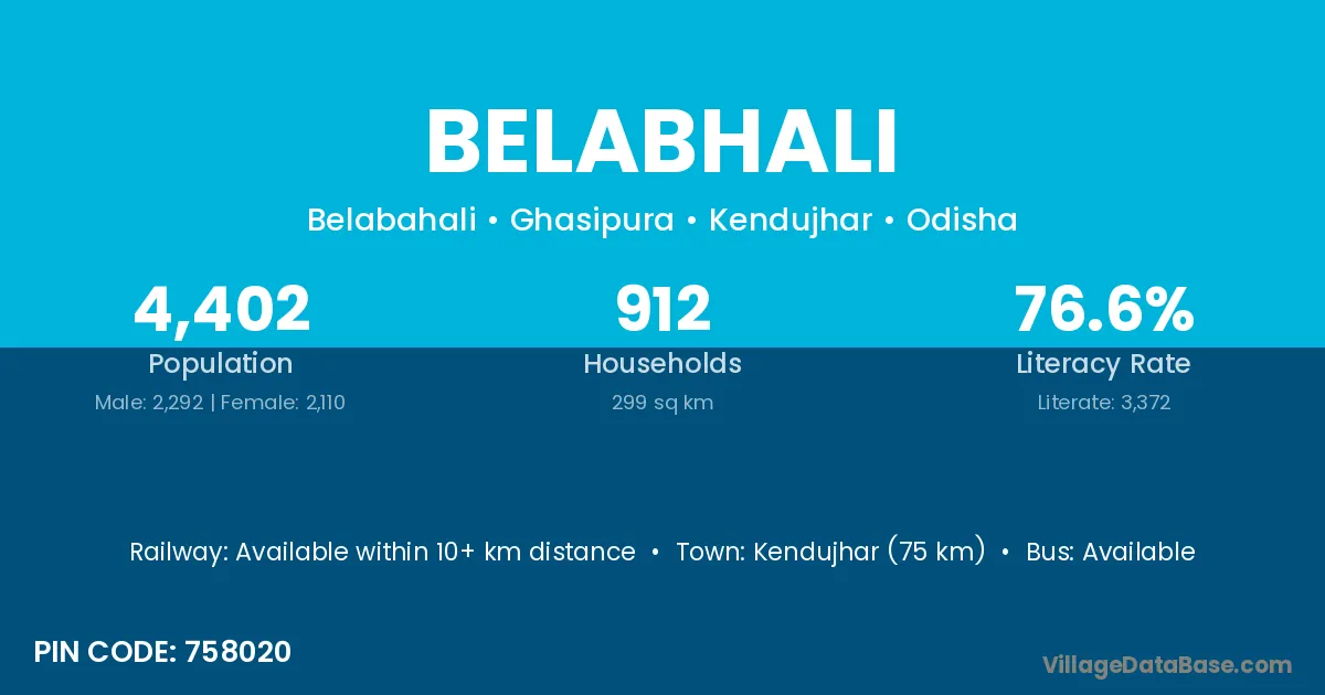 Kendujhar (75 km) is the nearest town to Belabhali village for major economic activities and is located approximately 75 km away.