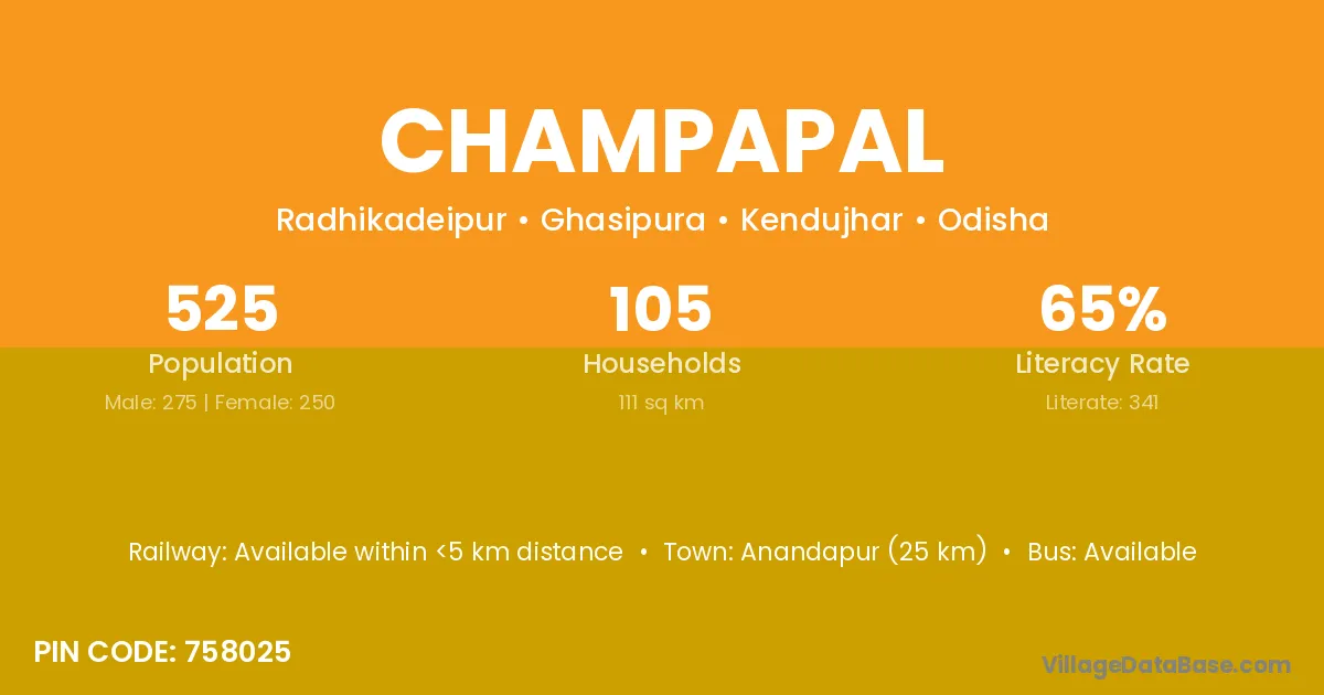 Anandapur (25 km) is the nearest town to Champapal village for major economic activities and is located approximately 25 km away.