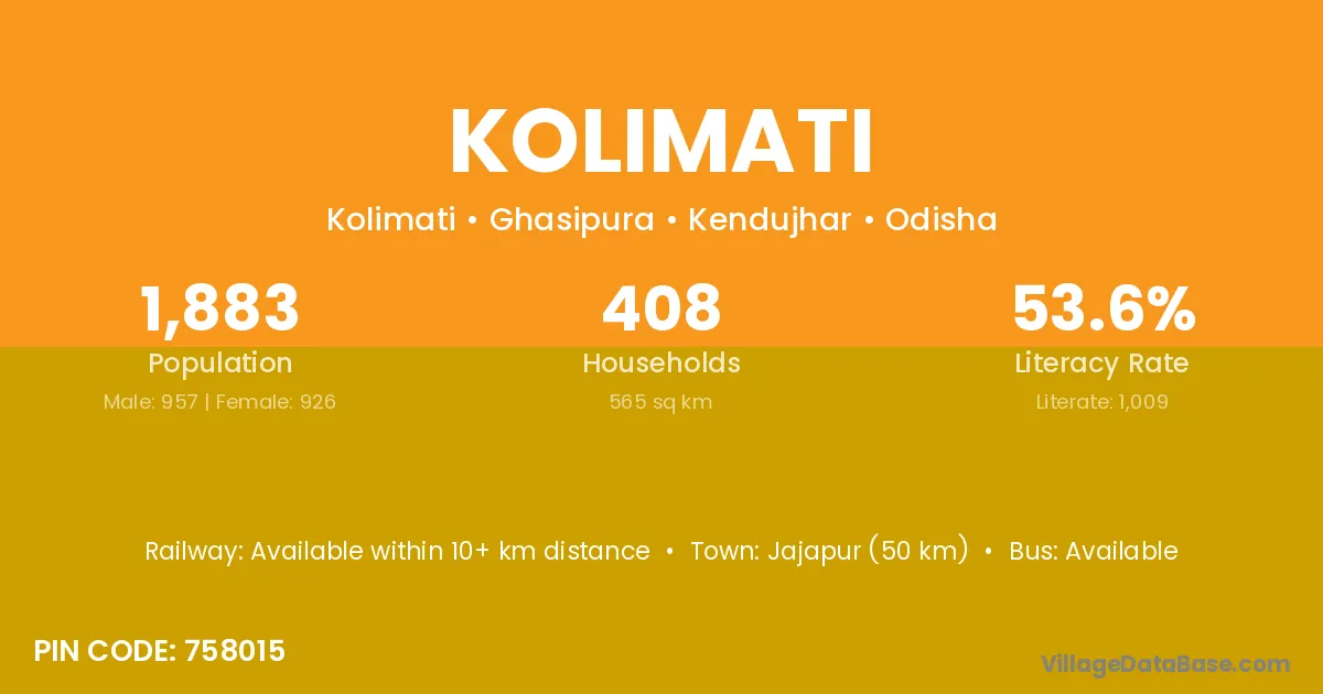 Jajapur (50 km) is the nearest town to Kolimati village for major economic activities and is located approximately 50 km away.