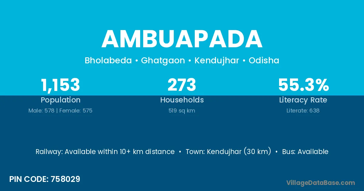 Kendujhar (30 km) is the nearest town to Ambuapada village for major economic activities and is located approximately 30 km away.