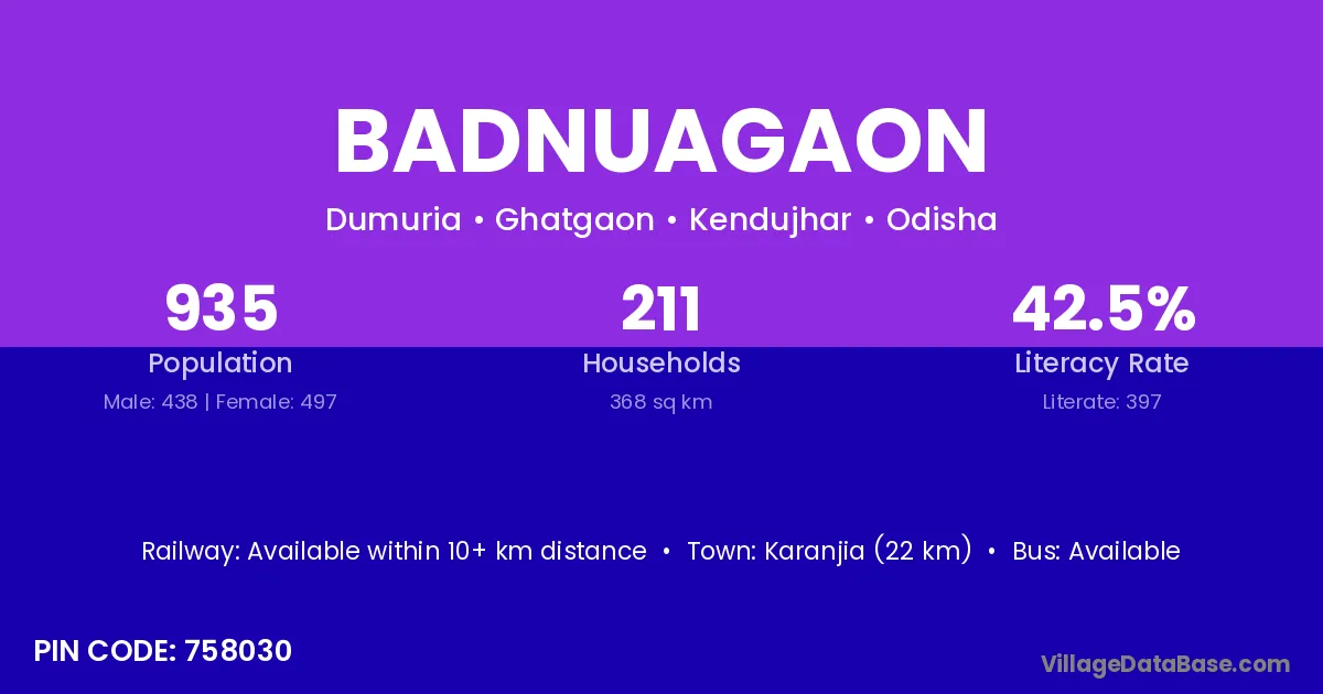 Karanjia (22 km) is the nearest town to Badnuagaon village for major economic activities and is located approximately 22 km away.
