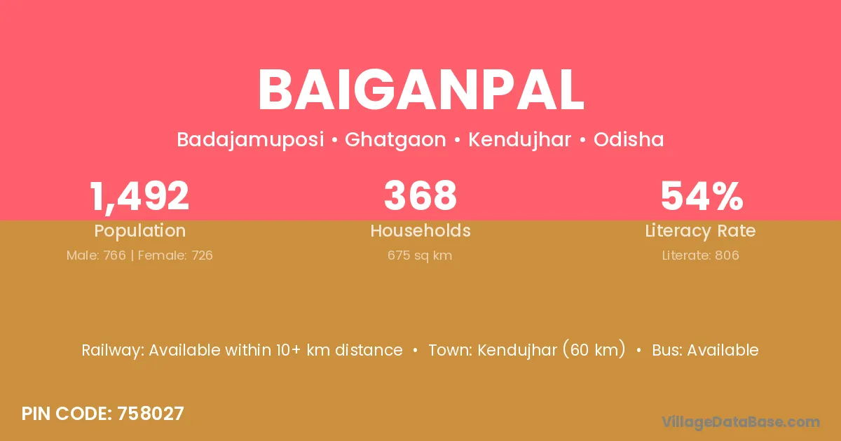 Kendujhar (60 km) is the nearest town to Baiganpal village for major economic activities and is located approximately 60 km away.