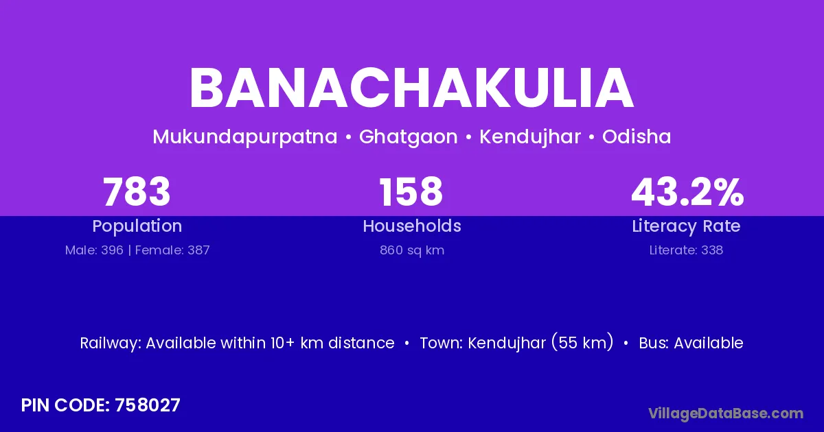Kendujhar (55 km) is the nearest town to Banachakulia village for major economic activities and is located approximately 55 km away.