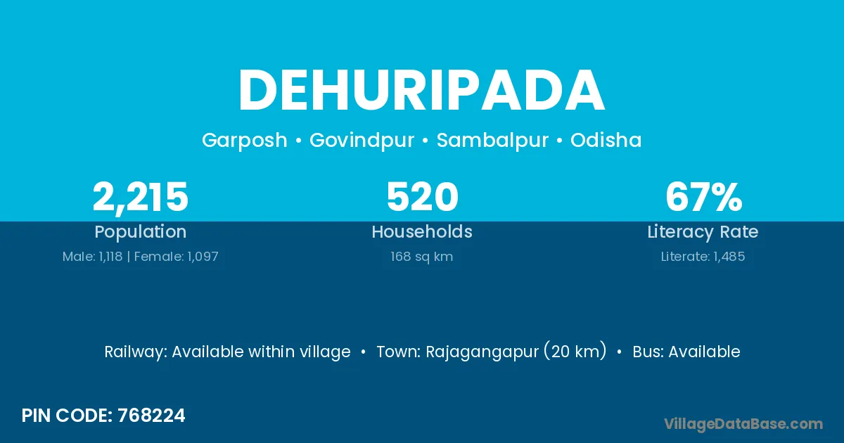 Kendujhar (40 km) is the nearest town to Dehuripada village for major economic activities and is located approximately 40 km away.