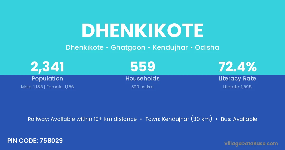 Kendujhar (30 km) is the nearest town to Dhenkikote village for major economic activities and is located approximately 30 km away.