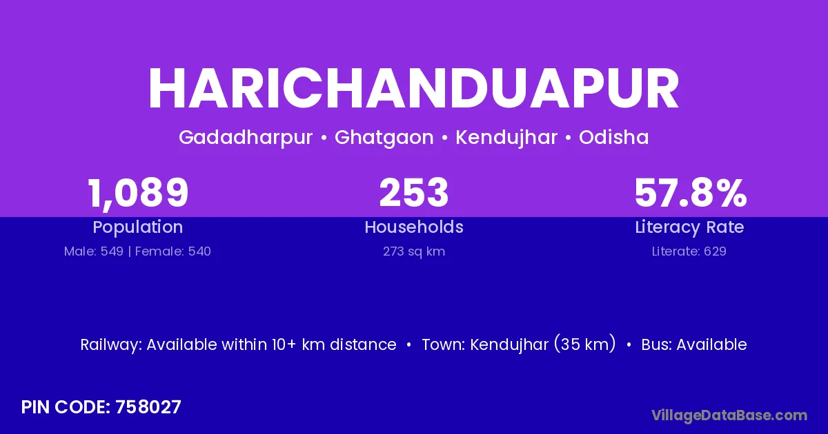 Kendujhar (35 km) is the nearest town to Harichanduapur village for major economic activities and is located approximately 35 km away.