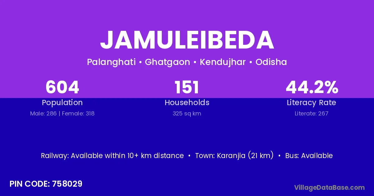 Karanjia (21 km) is the nearest town to Jamuleibeda village for major economic activities and is located approximately 21 km away.