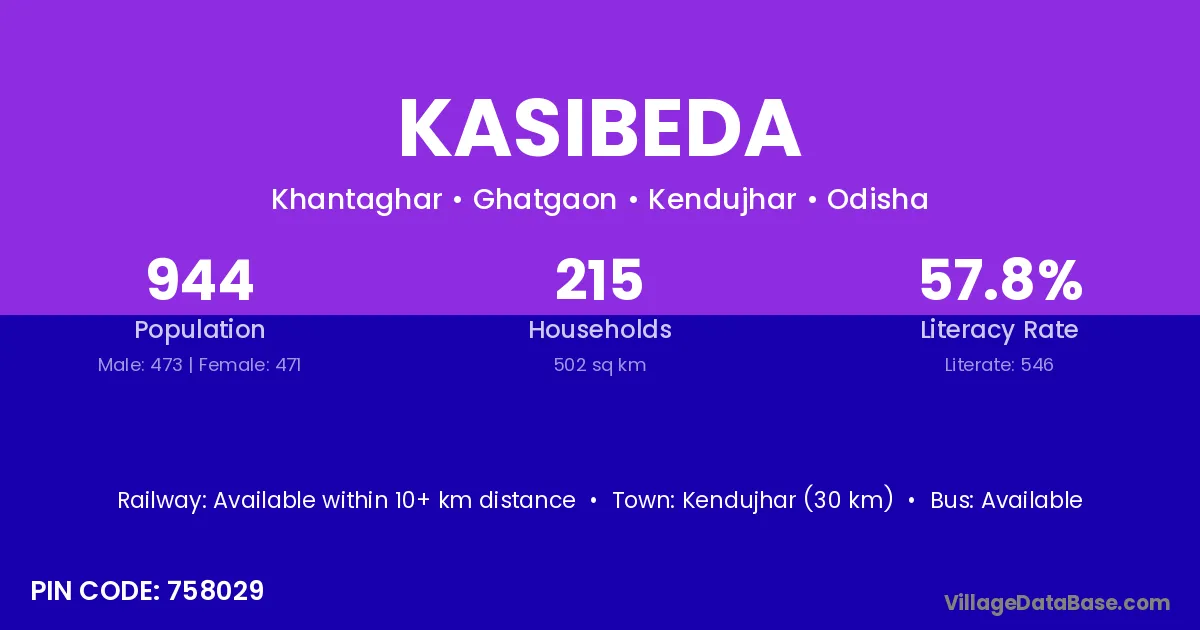 Kendujhar (30 km) is the nearest town to Kasibeda village for major economic activities and is located approximately 30 km away.