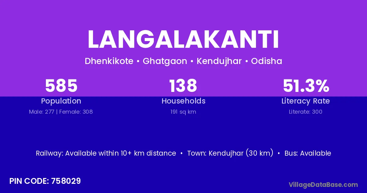 Kendujhar (30 km) is the nearest town to Langalakanti village for major economic activities and is located approximately 30 km away.