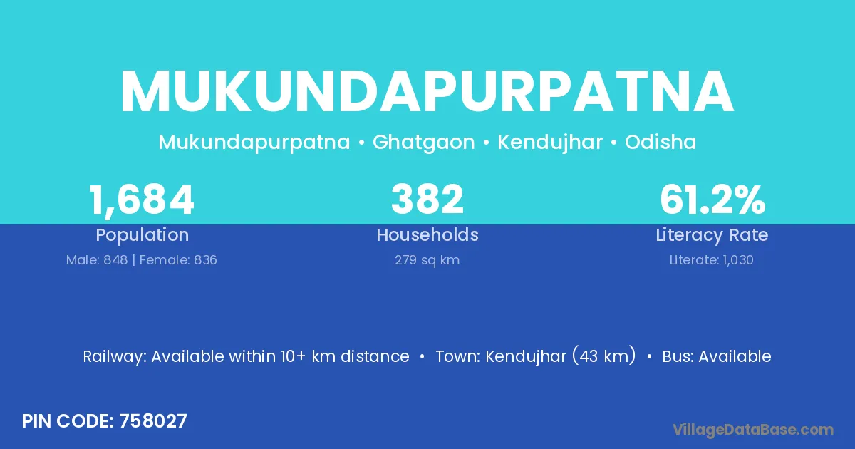Kendujhar (43 km) is the nearest town to Mukundapurpatna village for major economic activities and is located approximately 43 km away.