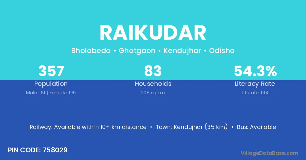 Kendujhar (35 km) is the nearest town to Raikudar village for major economic activities and is located approximately 35 km away.