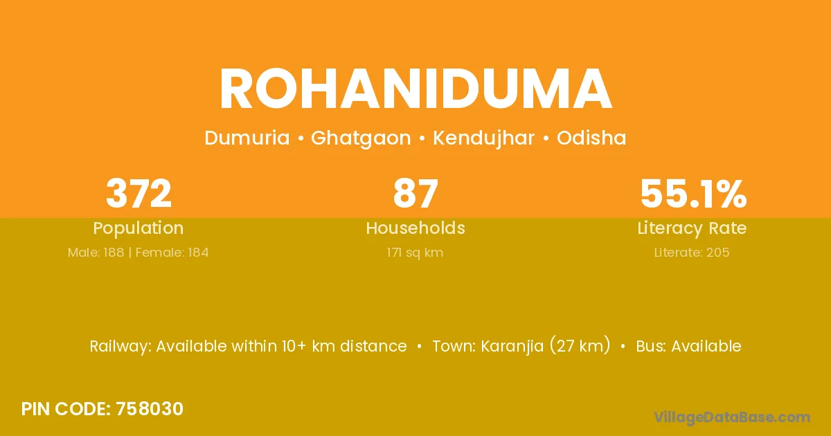 Karanjia (27 km) is the nearest town to Rohaniduma village for major economic activities and is located approximately 27 km away.