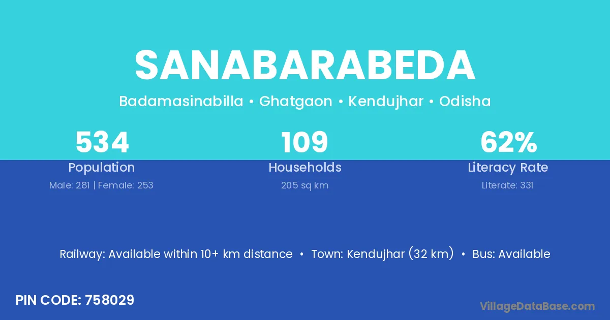 Kendujhar (32 km) is the nearest town to Sanabarabeda village for major economic activities and is located approximately 32 km away.