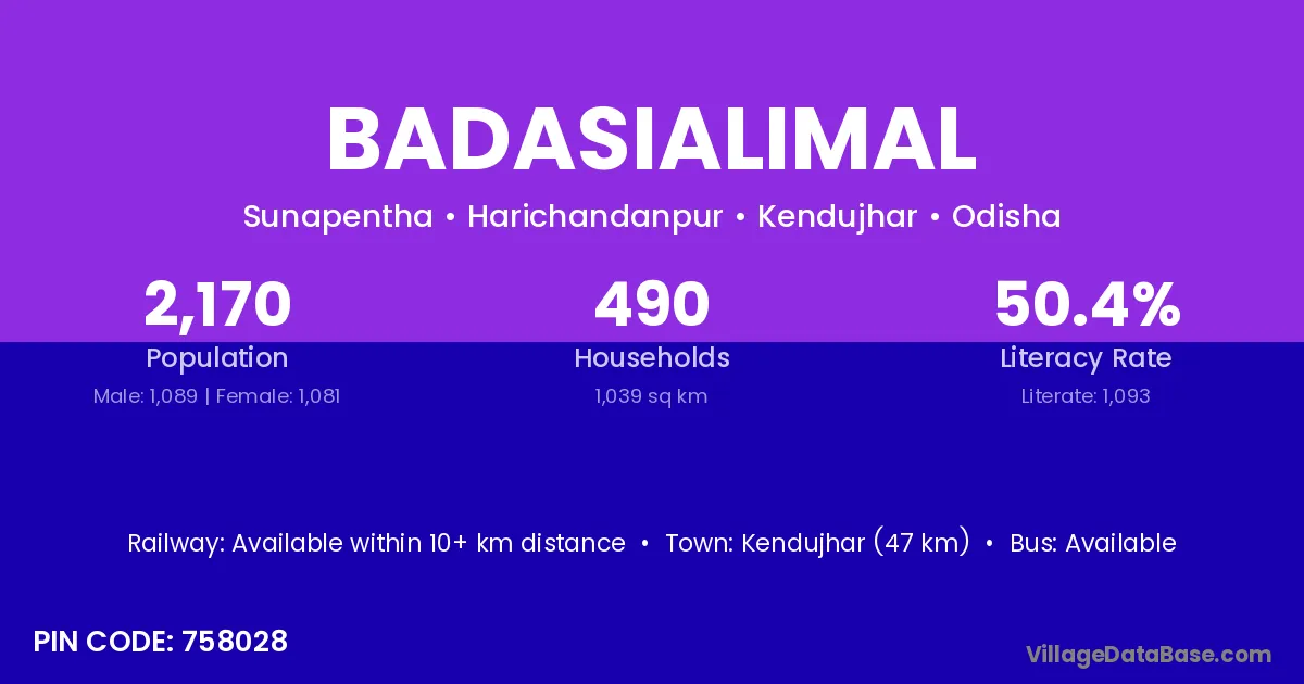 Kendujhar (47 km) is the nearest town to Badasialimal village for major economic activities and is located approximately 47 km away.