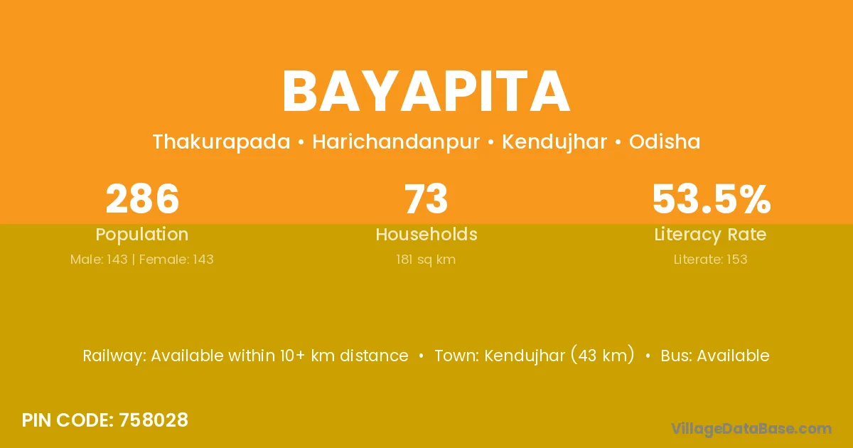 Kendujhar (43 km) is the nearest town to Bayapita village for major economic activities and is located approximately 43 km away.