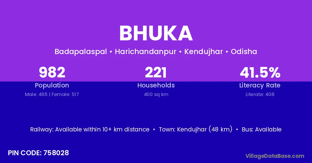 Kendujhar (48 km) is the nearest town to Bhuka village for major economic activities and is located approximately 48 km away.