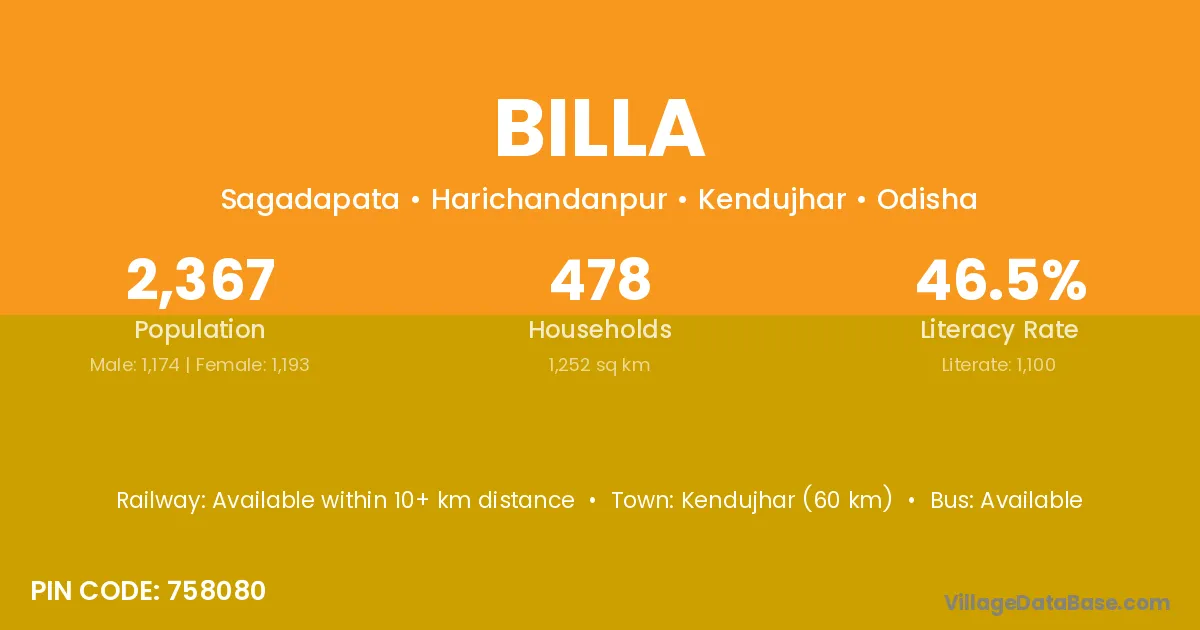 Kendujhar (60 km) is the nearest town to Billa village for major economic activities and is located approximately 60 km away.