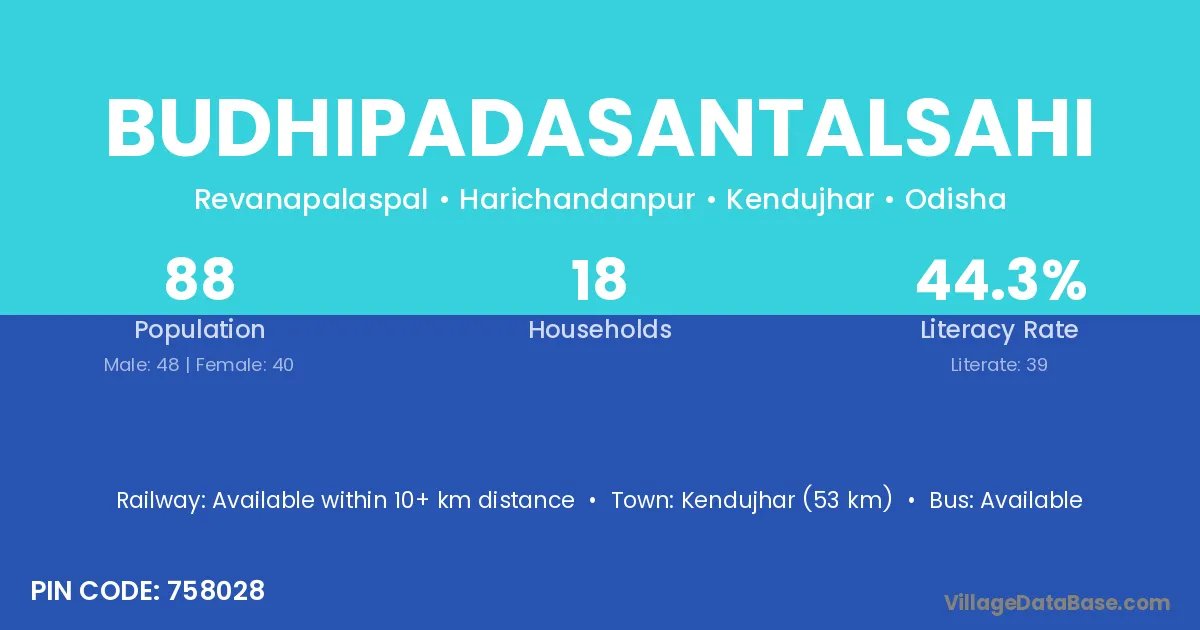 Kendujhar (53 km) is the nearest town to Budhipadasantalsahi village for major economic activities and is located approximately 53 km away.