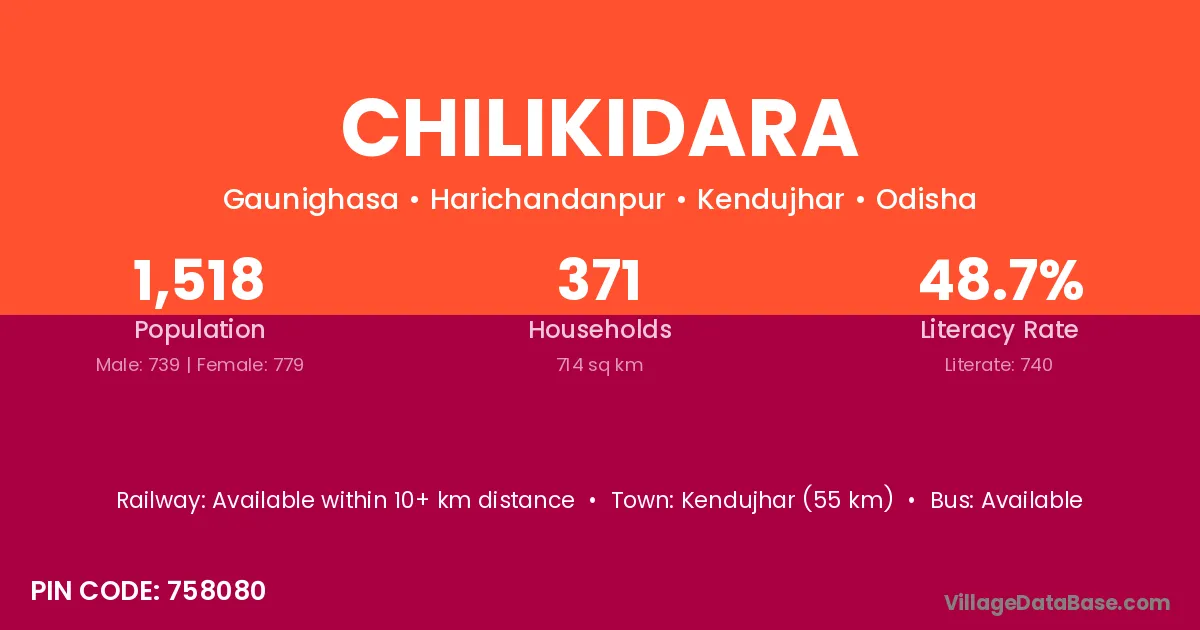Kendujhar (55 km) is the nearest town to Chilikidara village for major economic activities and is located approximately 55 km away.