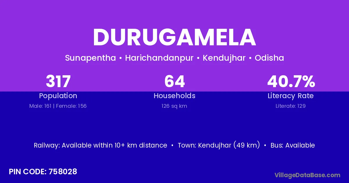 Kendujhar (49 km) is the nearest town to Durugamela village for major economic activities and is located approximately 49 km away.