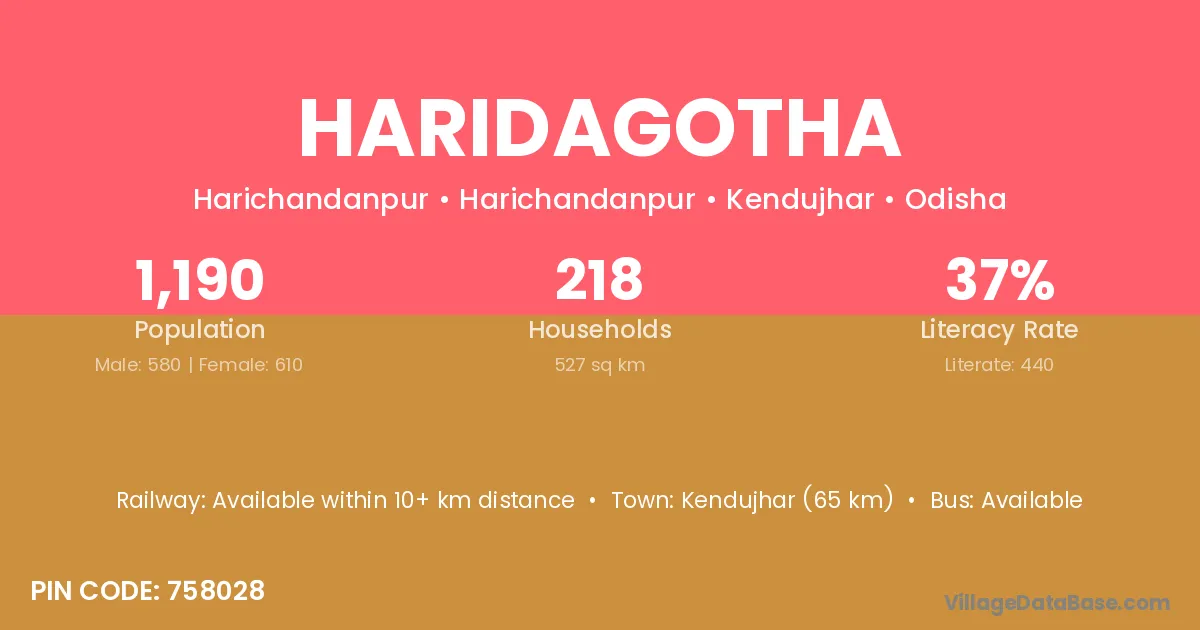 Haridagotha village has a total population of 1,190 people, of which 580 are males and 610 are females.