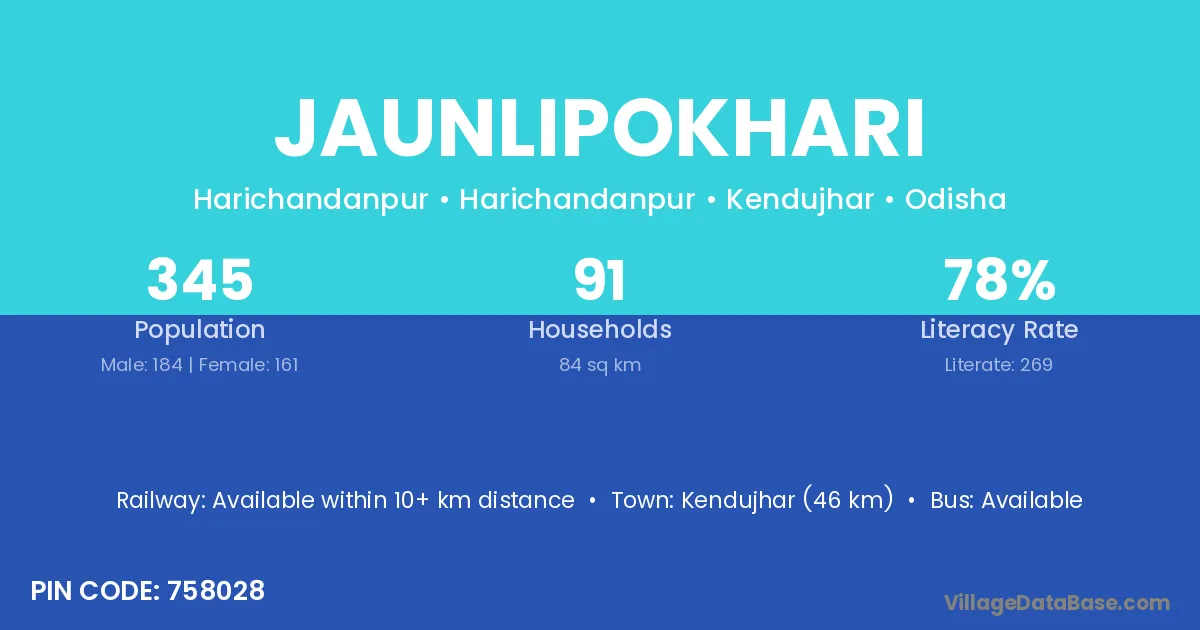Kendujhar (46 km) is the nearest town to Jaunlipokhari village for major economic activities and is located approximately 46 km away.