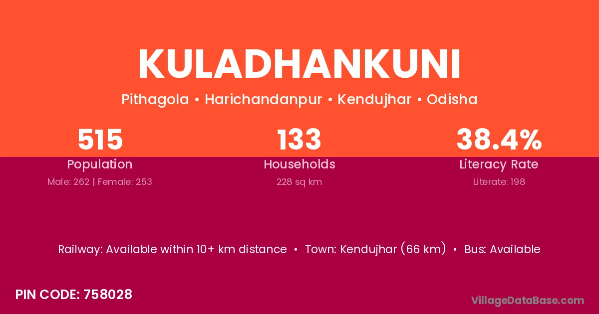 Kuladhankuni village has a total population of 515 people, of which 262 are males and 253 are females.