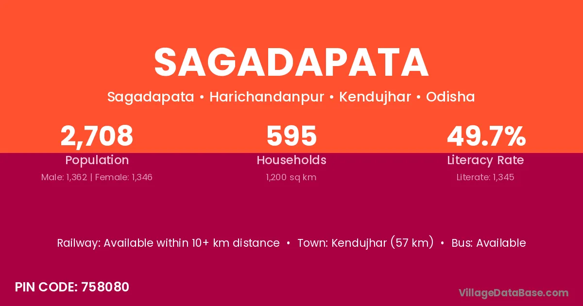 Kendujhar (57 km) is the nearest town to Sagadapata village for major economic activities and is located approximately 57 km away.