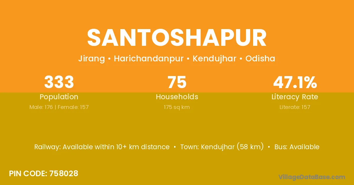 Kendujhar (58 km) is the nearest town to Santoshapur village for major economic activities and is located approximately 58 km away.