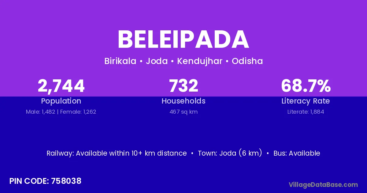 Joda (6 km) is the nearest town to Beleipada village for major economic activities and is located approximately 6 km away.