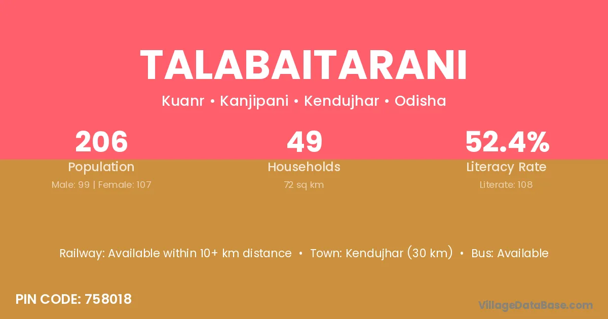 Kendujhar (30 km) is the nearest town to Talabaitarani village for major economic activities and is located approximately 30 km away.