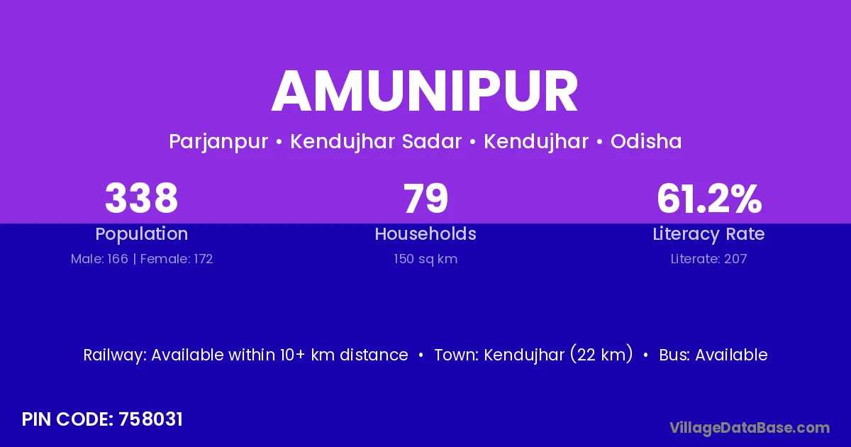 Kendujhar (22 km) is the nearest town to Amunipur village for major economic activities and is located approximately 22 km away.