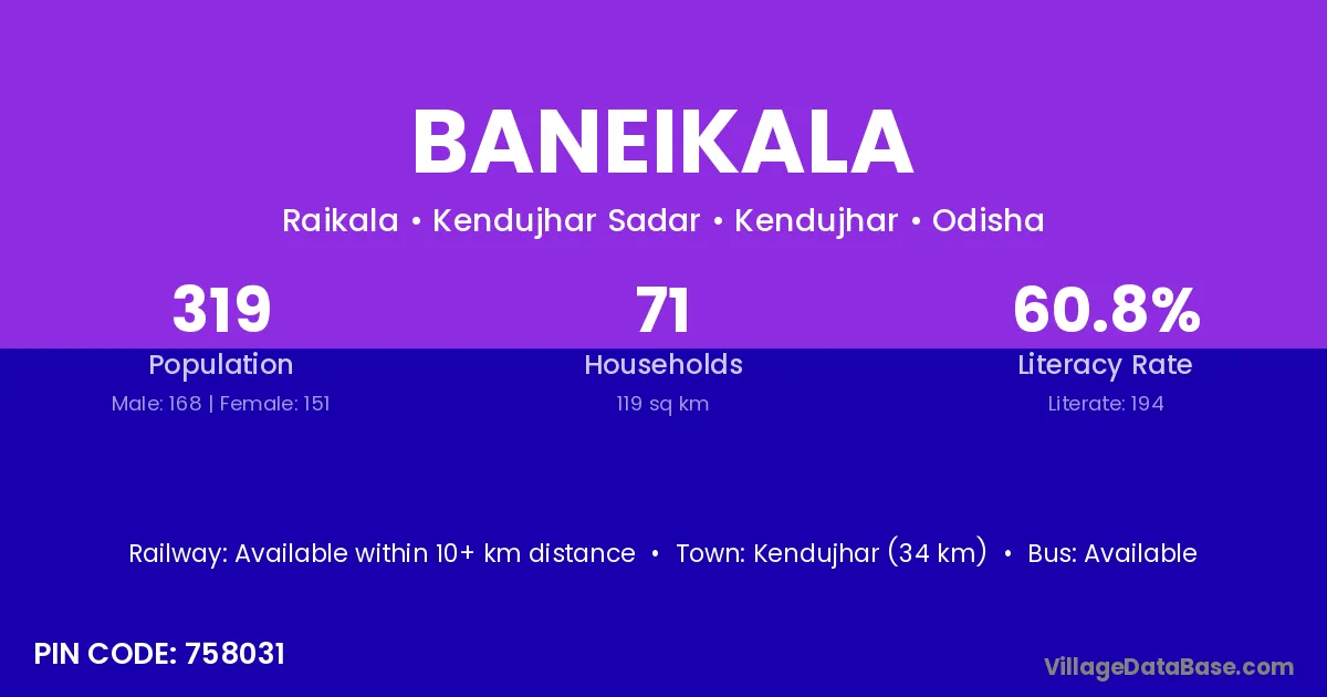 Kendujhar (34 km) is the nearest town to Baneikala village for major economic activities and is located approximately 34 km away.
