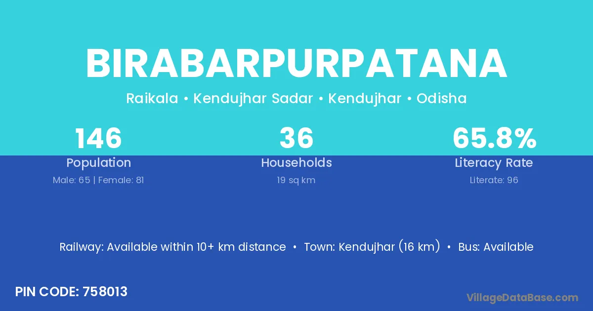 Kendujhar (16 km) is the nearest town to Birabarpurpatana village for major economic activities and is located approximately 16 km away.