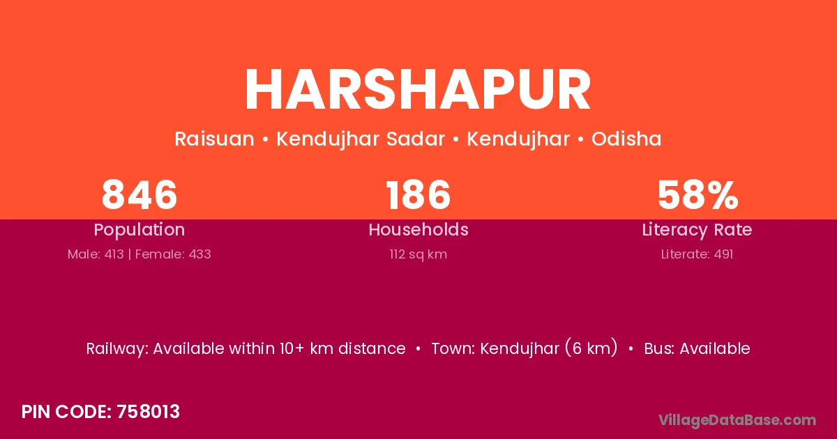 Kendujhar (6 km) is the nearest town to Harshapur village for major economic activities and is located approximately 6 km away.