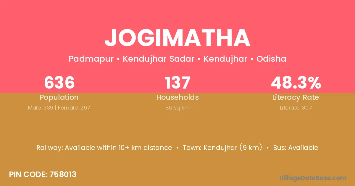 Kendujhar (9 km) is the nearest town to Jogimatha village for major economic activities and is located approximately 9 km away.