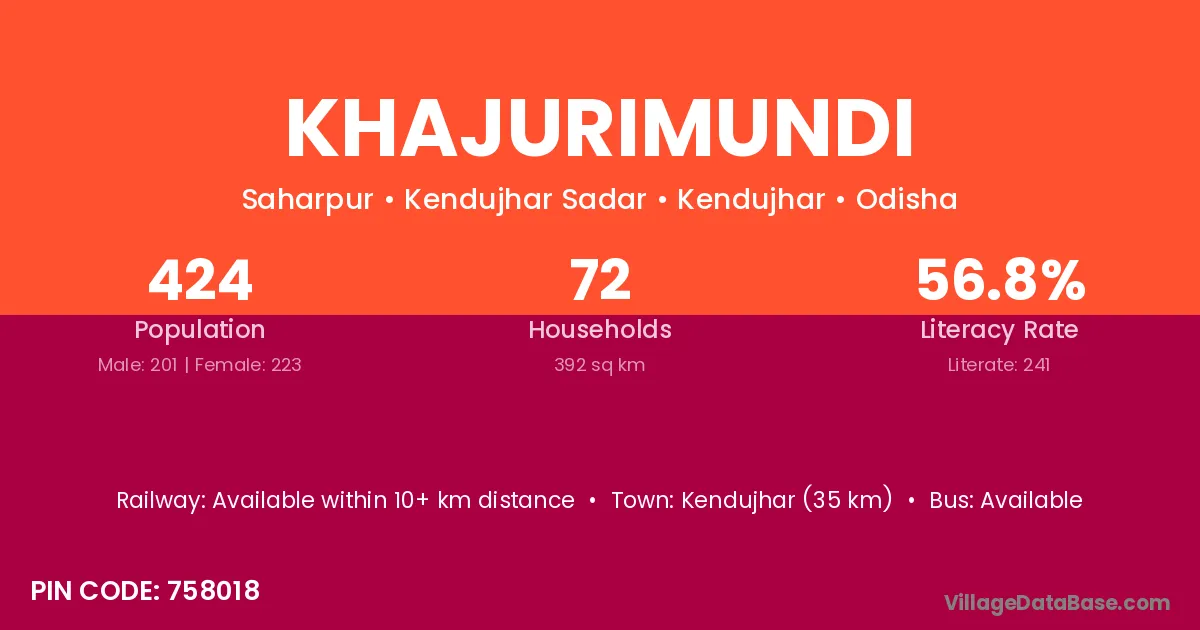 Kendujhar (35 km) is the nearest town to Khajurimundi village for major economic activities and is located approximately 35 km away.
