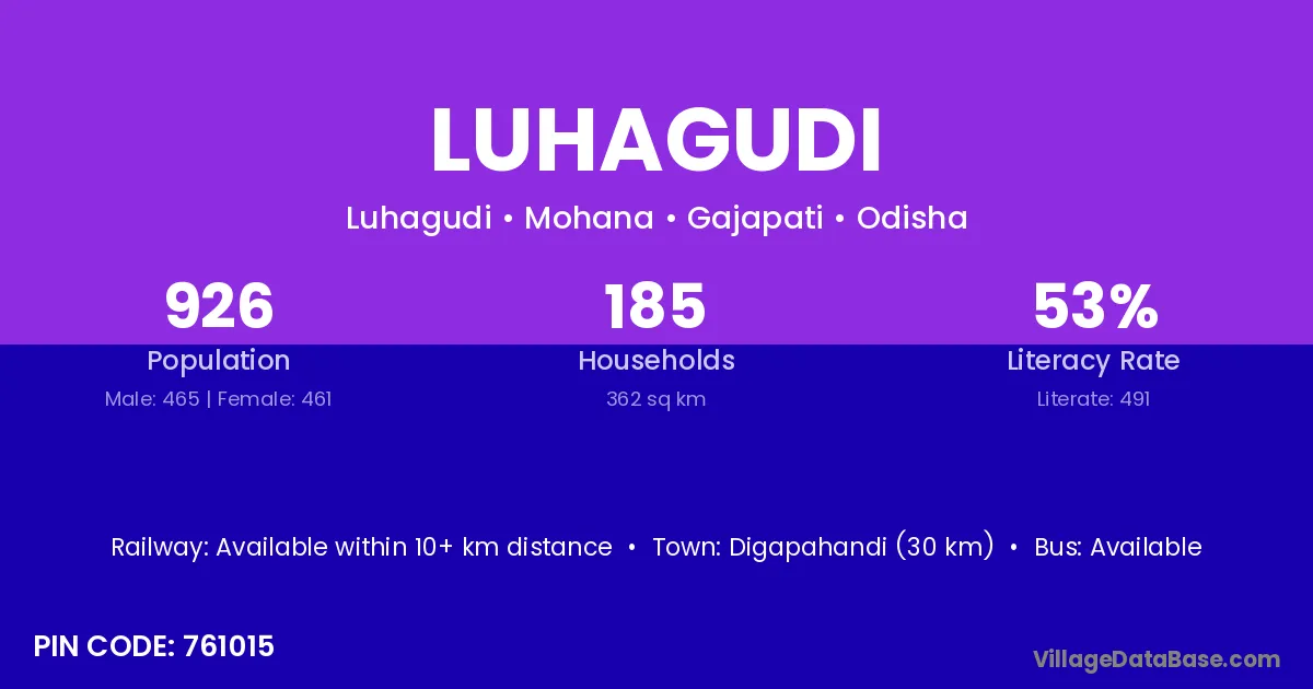 Kendujhar (20 km) is the nearest town to Luhagudi village for major economic activities and is located approximately 20 km away.