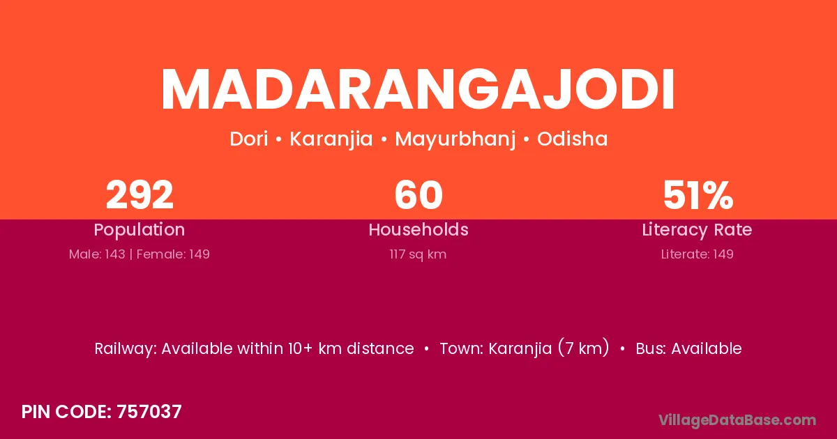 Kendujhar (12 km) is the nearest town to Madarangajodi village for major economic activities and is located approximately 12 km away.