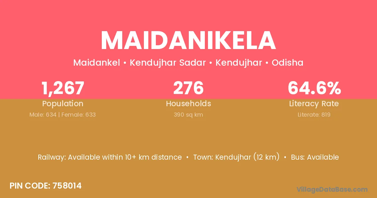 Kendujhar (12 km) is the nearest town to Maidanikela village for major economic activities and is located approximately 12 km away.