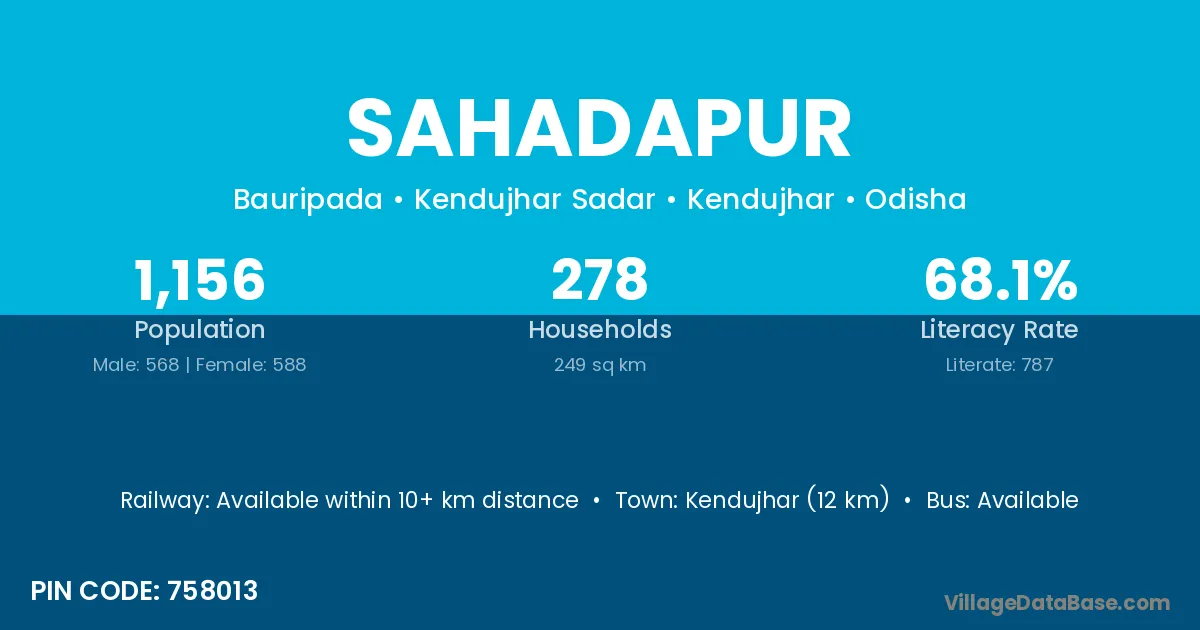 Kendujhar (12 km) is the nearest town to Sahadapur village for major economic activities and is located approximately 12 km away.