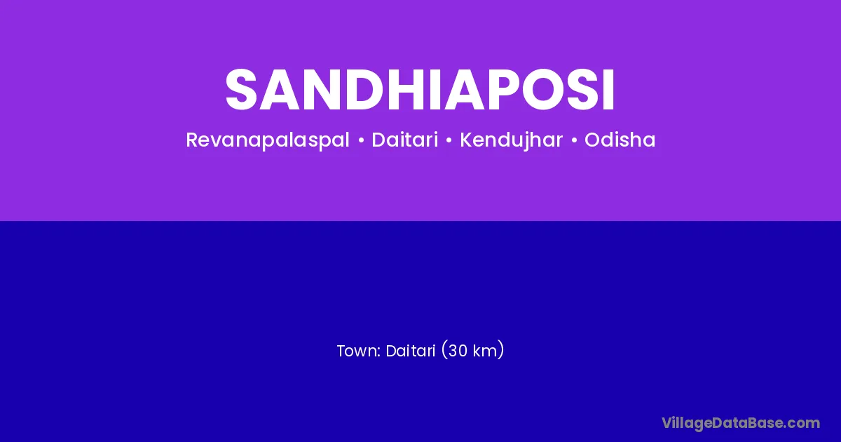 Kendujhar (23 km) is the nearest town to Sandhiaposi village for major economic activities and is located approximately 23 km away.