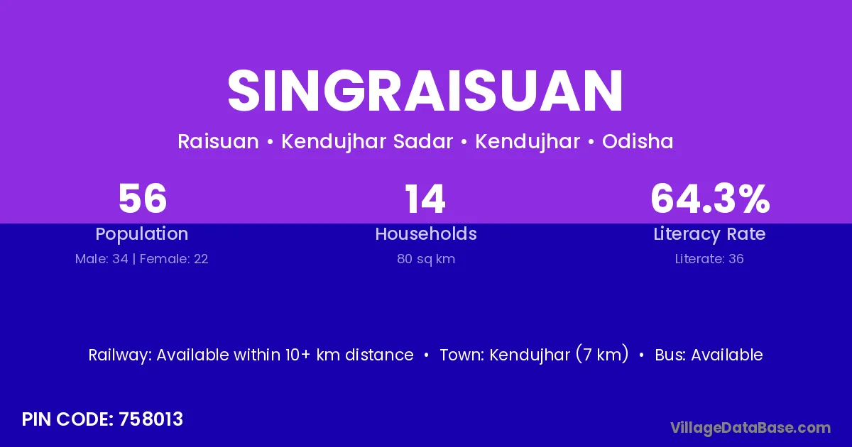 Kendujhar (7 km) is the nearest town to Singraisuan village for major economic activities and is located approximately 7 km away.