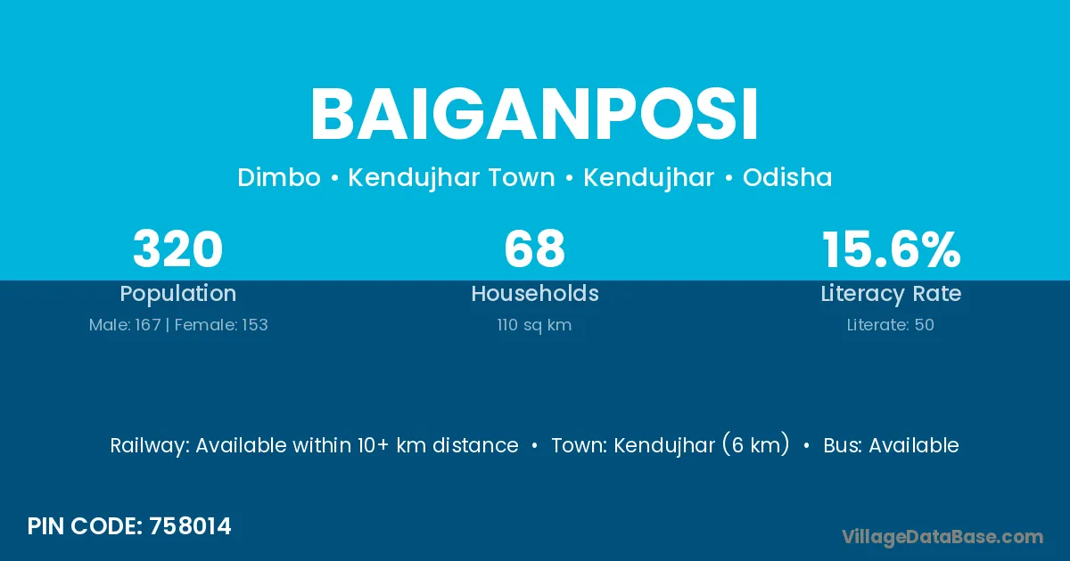 Kendujhar (6 km) is the nearest town to Baiganposi village for major economic activities and is located approximately 6 km away.
